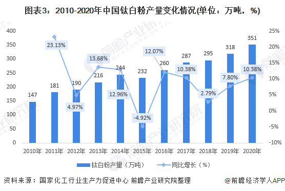 随着我国钛白粉生产技术和设备的不断成熟,我国钛白粉产量基本呈不断上升趋势,十年来仅有2015年的产量出现下滑。据国家化工行业生产力促进中心钛白分中心和钛白粉产业技术创新战略联盟秘书处统计,我国所有全流程型钛白粉生产企业的各类钛白粉及相关产品综合产量,从2010年的年产147万吨,跃升至2020年的351万吨,增长一倍有余。