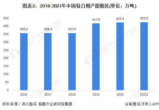 据百川盈孚数据统计,2016年全国钛白粉总产能358.4万吨,2017-2018年产能较为平稳,2019年全国产能大幅增长,超过400万吨,2021年我国钛白粉产能达425.9万吨,目前处于较平稳增长阶段。